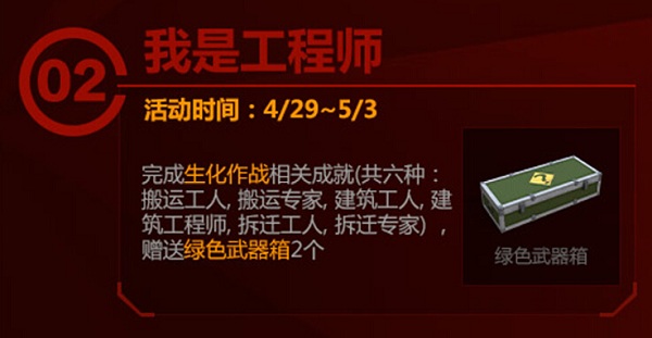 想要绿色武器箱子?那就快来完成生化作战的成就吧!在4月29日至5月3日的活动期间内,完成生化作战相关成就(共六种:搬运工人、搬运专家、建筑工人、建筑工程师、拆迁工人、拆迁专家),赠送绿色武器箱2个。