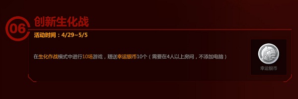 新模式“生化作战”今日上线,脑洞大开的全新玩法将给你另类生化体验。在4月29日至5月5日活动期间内,在生化作战模式中进行10场游戏,赠送幸运银币10个(需要在4人以上房间,不添加电脑)